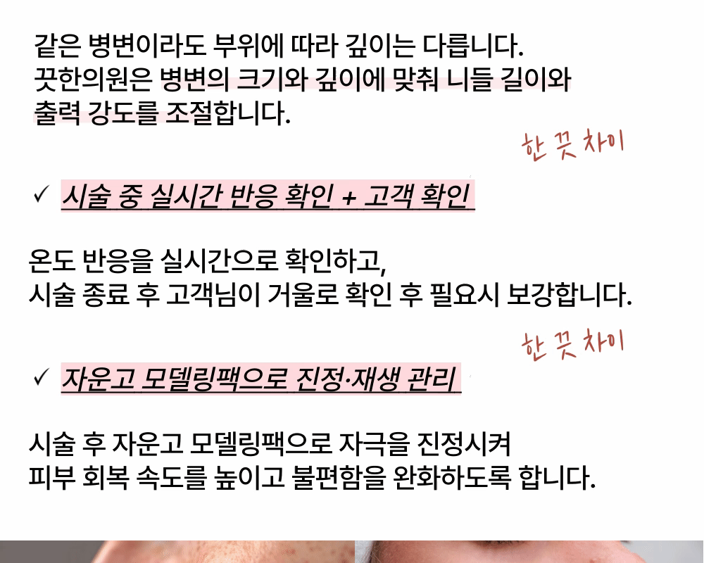 각 병변의 크기와 깊이에 따라 에너지 세기와 전달 시간을 정밀하게 조절하고, 반복 시술 시에도 같은 지점에 무작정 찌르지 않고 미세한 위치 조정을 통해 자극을 최소화합니다.