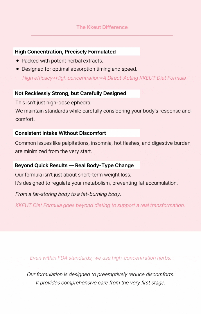 Bitter is Better! It's bitter. That's why it's powerful. Kkeut Korean Medicine Clinic's unique bitter diet pills, meticulously formulated with high-concentration medicinal ingredients! ✔ For those who are unsatisfied with existing diet results ✔ For those who want to induce a body type change without yo-yo effect ✔ For those who want intense stimulation for body fat