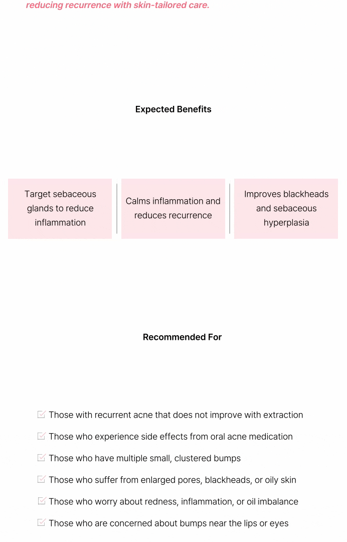 施術直後は紫雲膏モデリングパックで鎮静・クーリングし、回復速度と満足度を高めます。この差別化設計により、ニキビ・皮脂疾患治療の完成度を引き上げます。