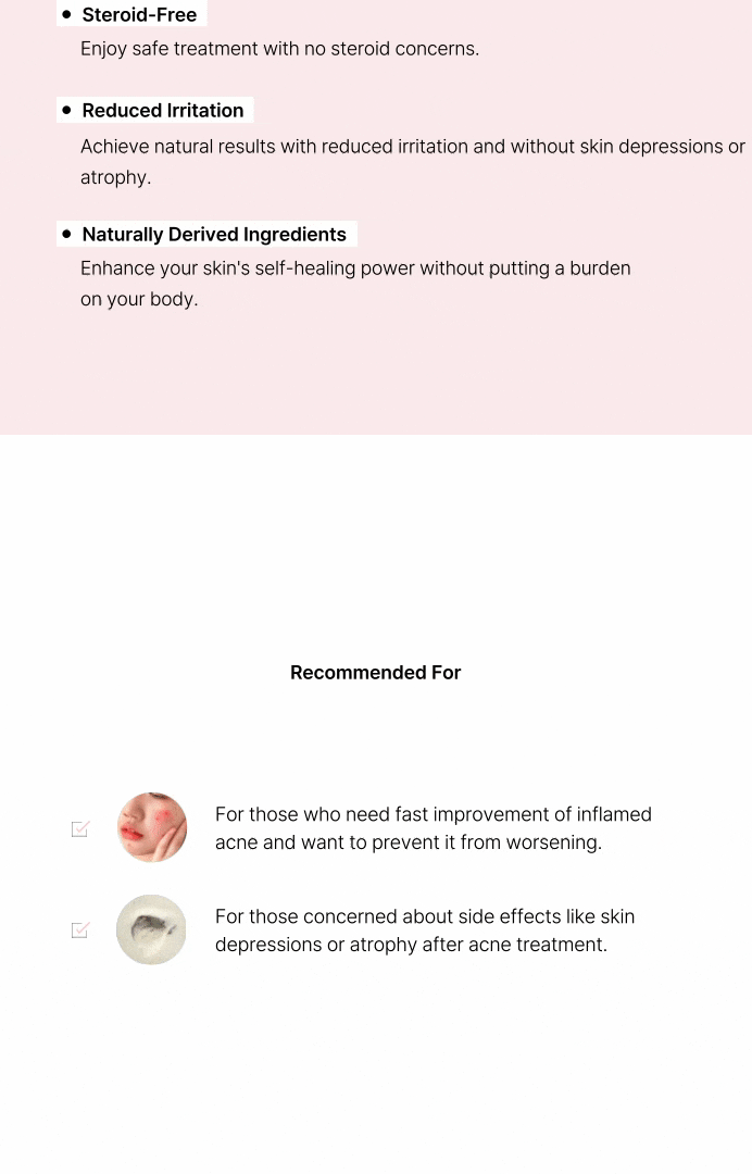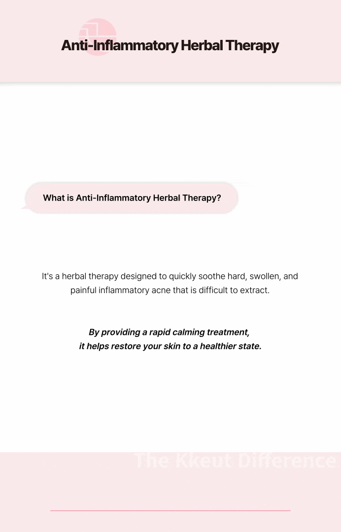 对于肿胀坚硬、难以挤出的炎症性痘痘,通过药针施术可快速镇静、舒缓炎症。 区别于传统的炎症注射(曲安奈德),无皮肤萎缩、凹陷或色素沉着等副作用,自然改善皮肤状态。 完全不含类固醇成分的安全抗炎护理。 采用天然韩方草本成分,无身体负担,同时提升皮肤再生能力。 *不含增值税